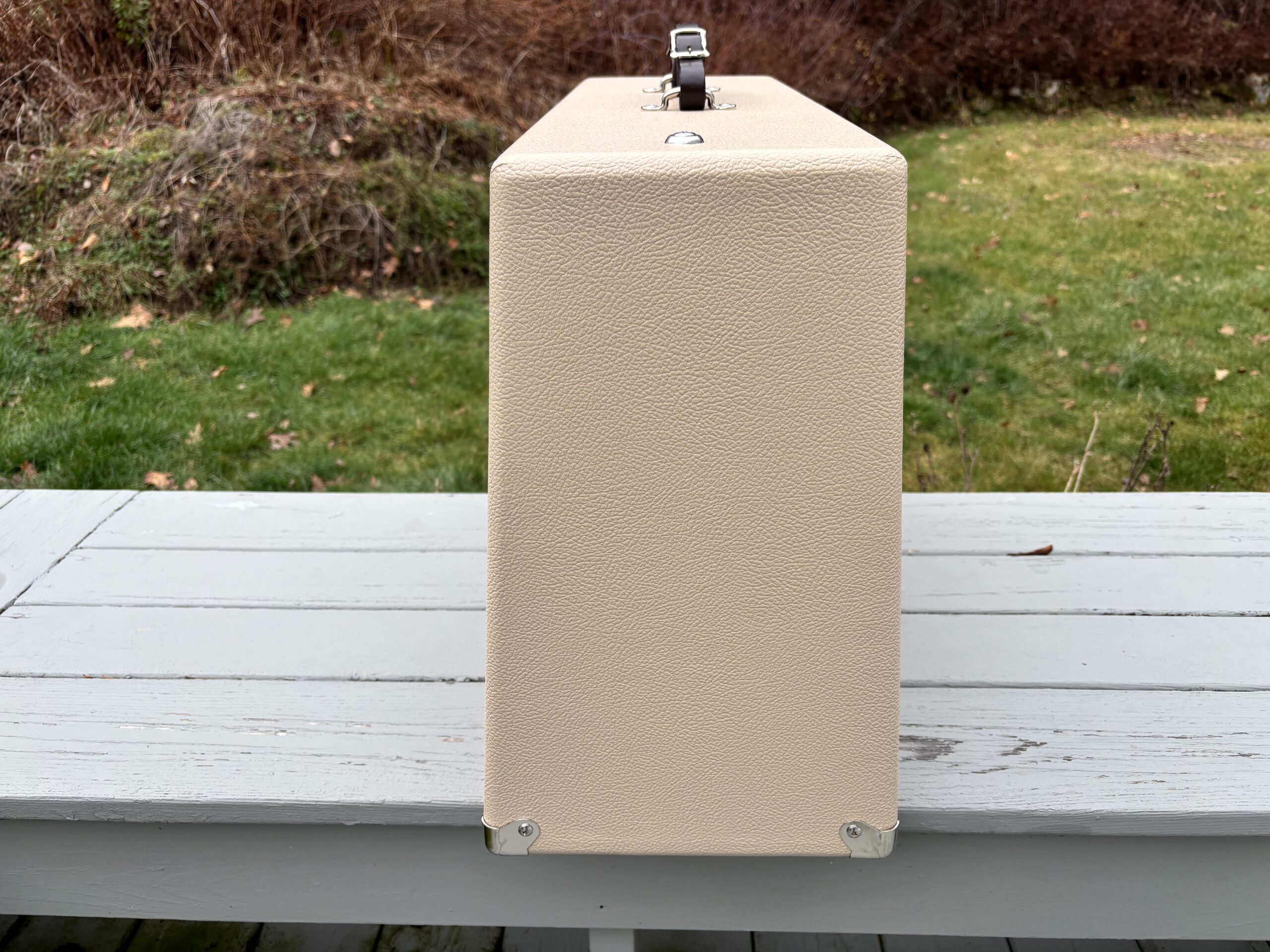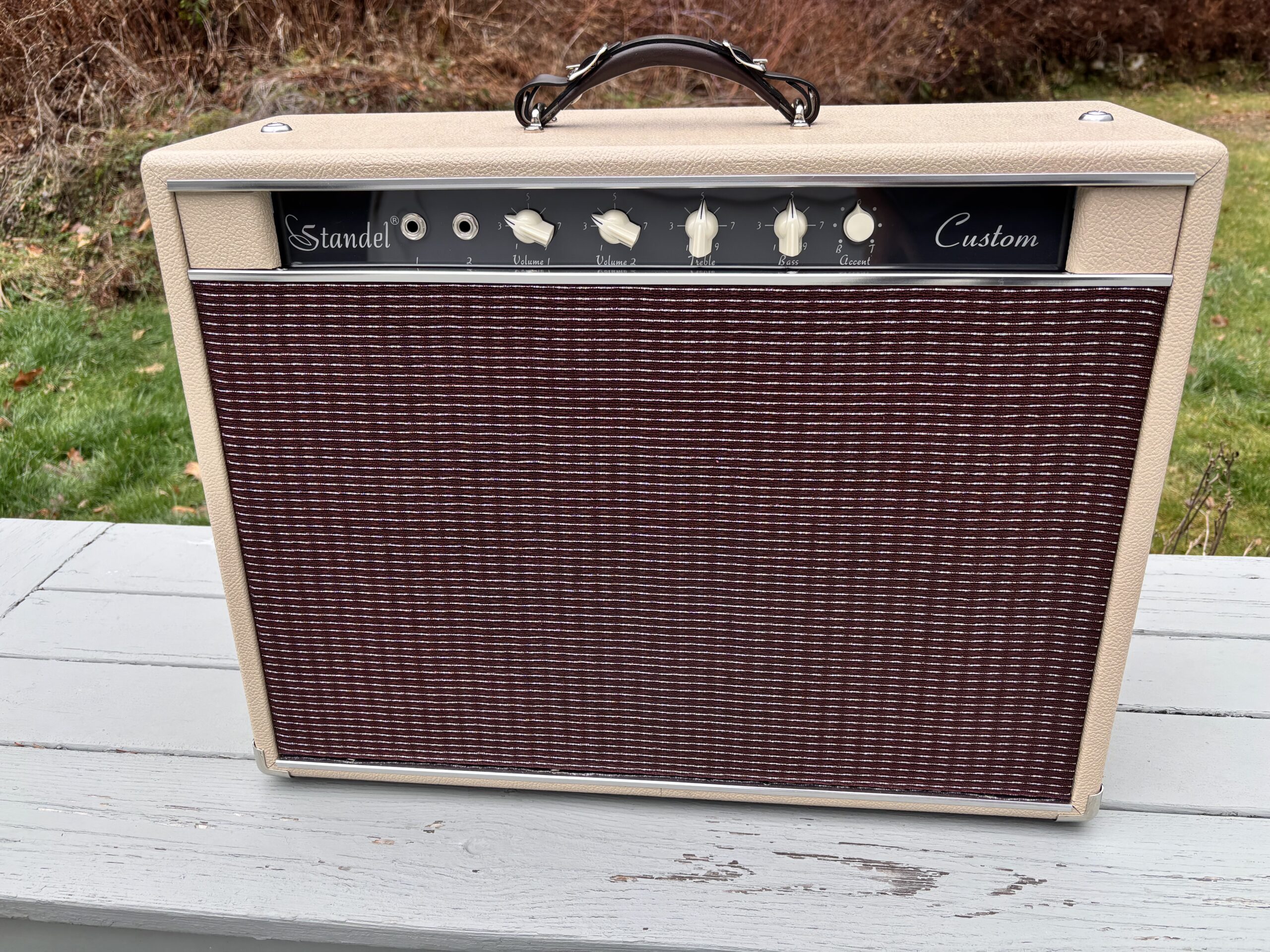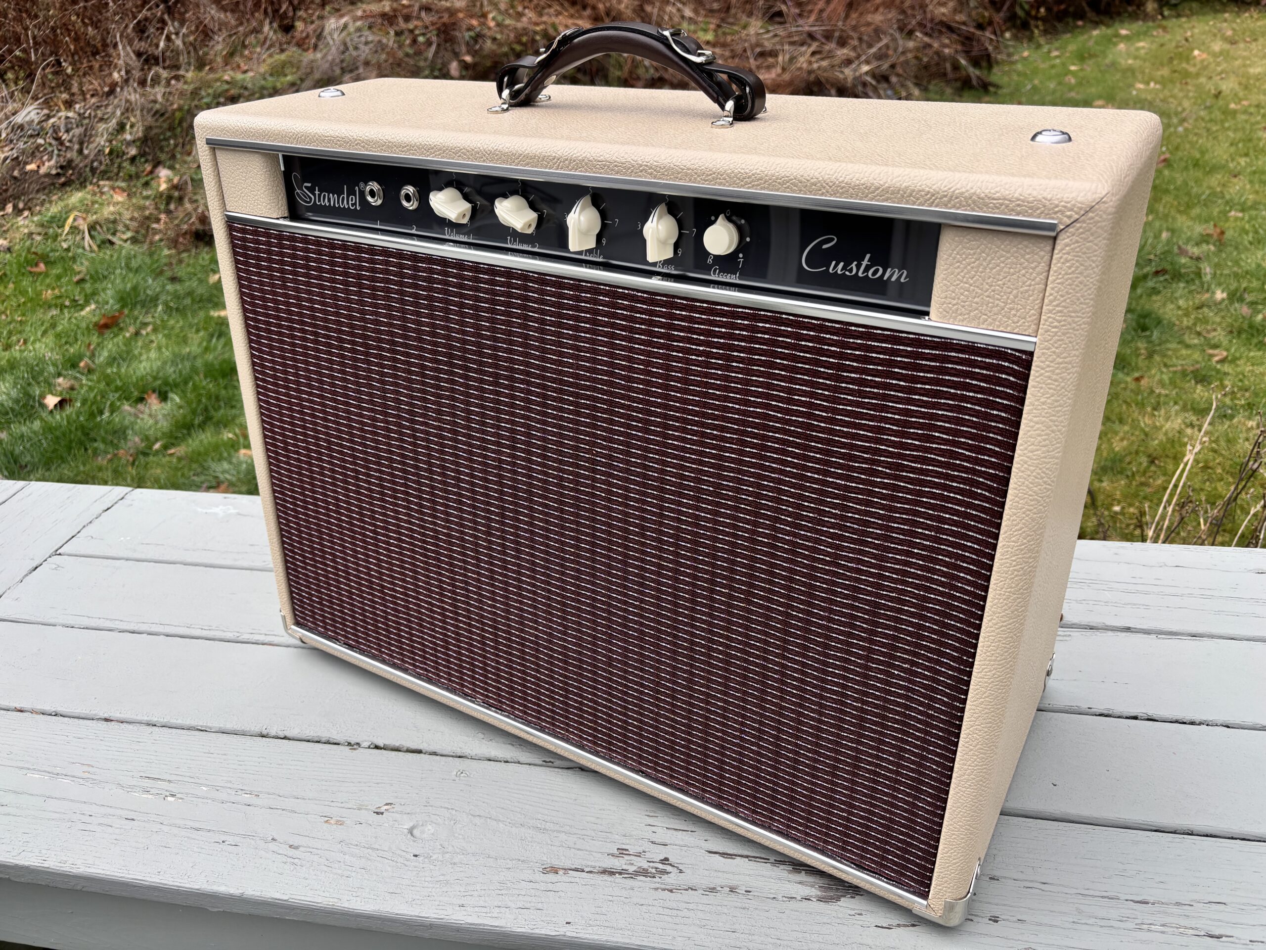 – Cabinet – Italian Poplar with Baltic birch baffle and back panels, Tolex covering in blonde or cream with oxblood grillcloth with silver stripe.